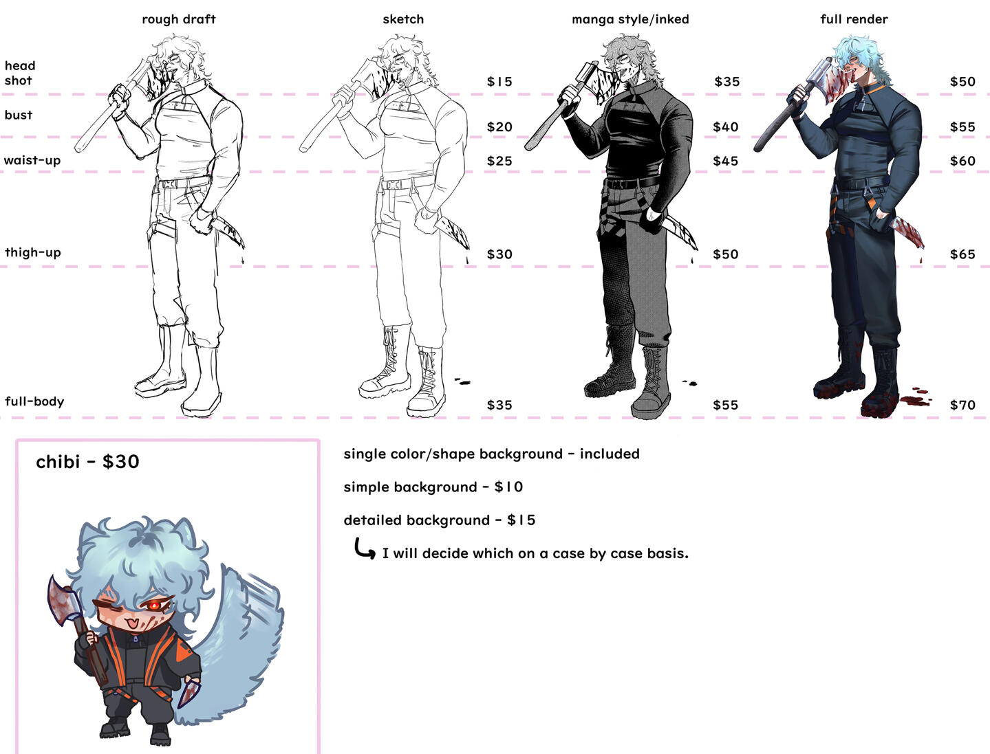 After discussing the content of the commission with the client, I will send one rough sketch and allow up to 3 changes free of charge. Any major changes after will require extra cost, which will be decided case by case. After approval of the rough sketch, I will move onto the next process of the artwork. If the commission falls under the 'sketchy' category, the client will not receive a rough draft but instead a sketch in which the process ends there. I will contact the client after I have finished each stage of the drawing: rough sketch, lineart, and rendering. For each stage, the client has 3 free changes. Any additional major changes will require extra cost, which will be decided case by case. Small changes with each stage do not require additional fees.If at any point the I feel the need to end the commission, depending on level of completion and complexity of the requested work, the client may receive a refund. However, if there is such a situation where the commission process ends after a 'fully rendered' artwork is past the rendering stage, 'manga-style inked' is past the effect stage, or 'character sheet' category commission is past the rendering and/or coloring stage, a refund will not be provided.